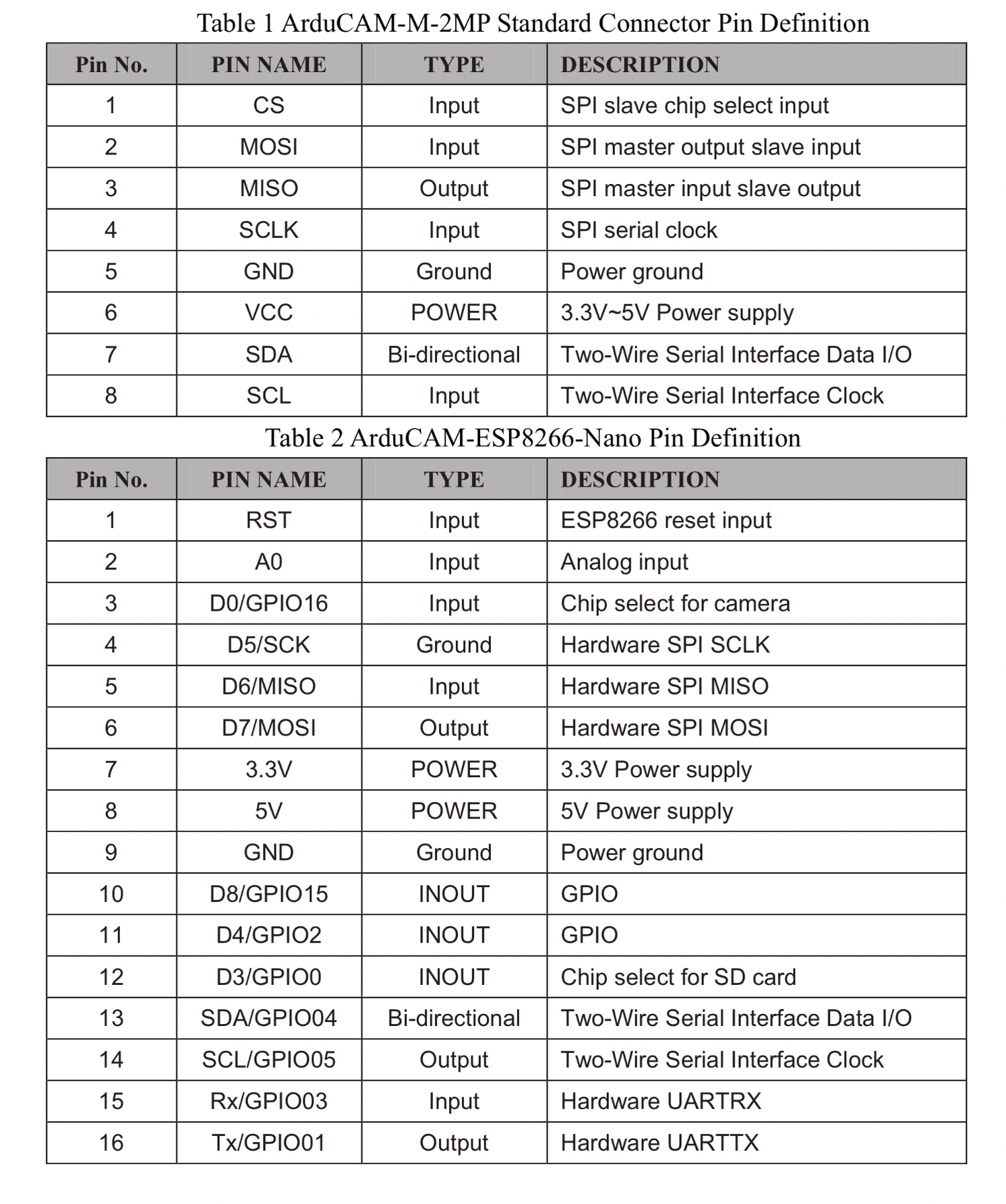 Using here a 2 megapixels ArduCam. There is also a 5 megapixels version. The Pin definition of the camera is like any other serial parallel interface device: