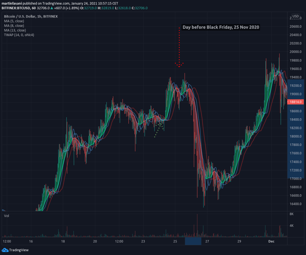 A -5% price down limit can “maybe” work after a very low moment, like in March 2020, or even in whole period till November 2020 since it was mostly in a bullish scheme going up all the time. But it’s not the normal situation, and everything that growths has pullbacks. This pullbacks are usually much higher than 5% and it maybe go 15 or even 20% down in a single day. That happens with everything if you see the stock marketing, but specially with Crypto. Now let’s check what happened in Black Friday as a first example: