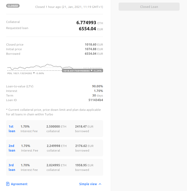Basically you get part of the money back in EUR (If you choose EUR as borrowed ticker) but the rest of your crypto is gone forever. So be aware that when choosing a -5% PDL you are taking an unusually high risk that can backfire in any moment, even if at the beginning is going up. To make a more visual example with my own bad technical analysis and failure, this was done with 2.5 ETH in January 22 aprox. in a moment where all Crypto was going down at least 10%: