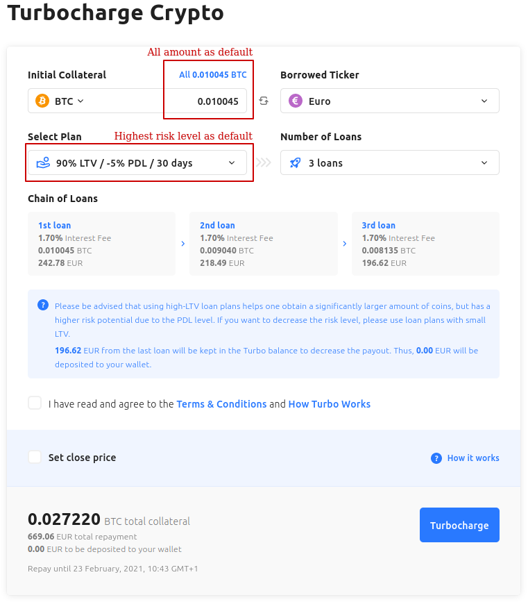With another option called Turbocharged loans happens something similar, let’s say I choose to Turbocharge my 0.010045 Bitcoin: