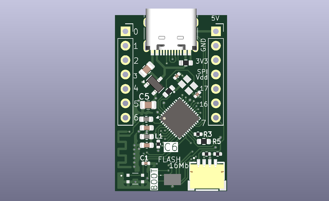 Sadly that is the bad kind of mistake. Because if it does not have flash then you cannot store your program anywhere rendering the PCB as a bricked device that you cannot flash. Then I’ve had two options: To use the C6-H4 32 pin QFN that comes with 4Mb internal flash or to use an external flash IC. As I never did that I wanted to make a “cheap test” first which resulted in the following PCB that we sent to JLCPCB assembly: